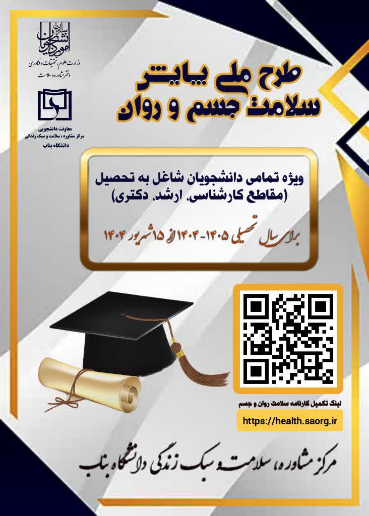 در راستای ارتقای سطح سلامت روانی و جسمی دانشجویان و در اجرای طرح ملی پایش سلامت، تمامی دانشجویان شاغل به تحصیل و جدیدالورود در تمامی مقاطع تحصیلی، موظفند کارنامه سلامت خود را از طریق سامانه ملی پایش سلامت دانشجویان کشور تکمیل نمایند: